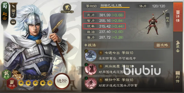 赵云满级后武力高达287左右、统率高达272左右,剩余的几个属性相较于其他武将也不落下风。而且这个角色主打的就是出其不意的突击,行军能力十足,能够在战场中纵横,是一个能够让敌人闻风丧胆的强力武将。