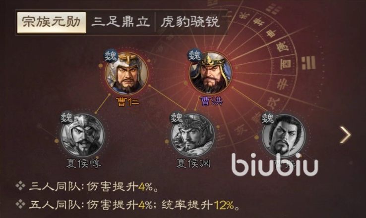 小编推荐的这一套组合采用了三人羁绊小队,加上两个散人来搭配,最主要的就是夏侯敦、夏侯渊和曹操的三人宗族,再搭配上王异和甄氏这两个辅助,就大功告成。本来魏国宗族元勋是由5名武将构成,但是小编认为另外两个曹仁和曹洪强度不够,曹仁虽然开荒好用,但是后期战法效果确实乏力,所以只能放弃。