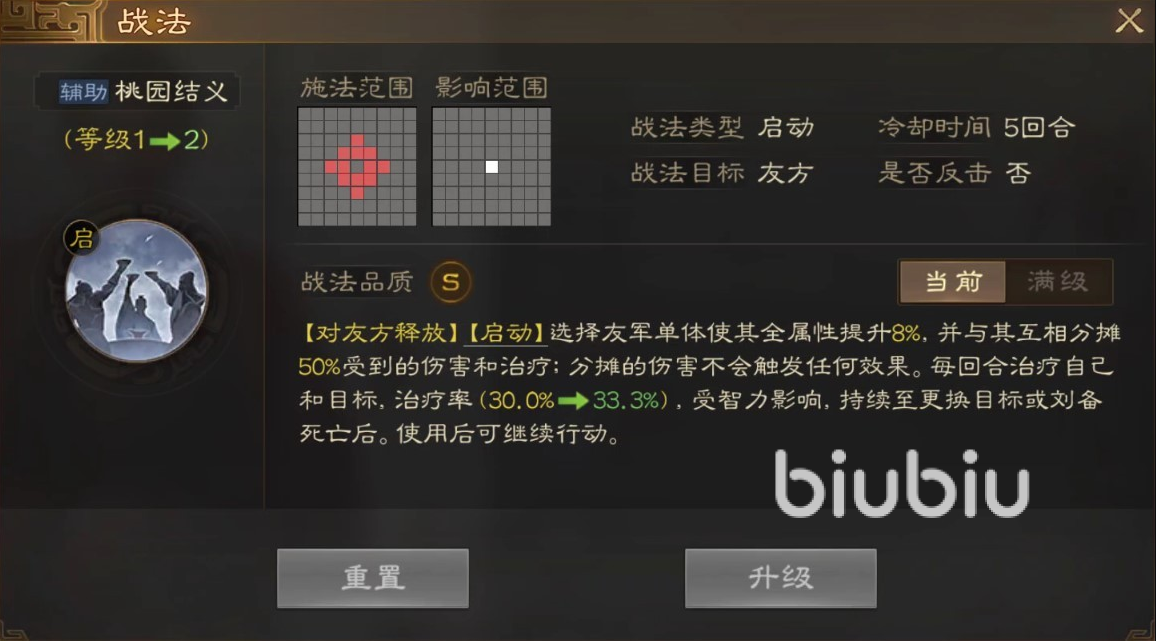 众多此类型战法中,小编最推荐的有桃园结义、登锋履刃、勇冠三军和七进七出。其中桃园结义属于刘备核心技能,也是整个游戏中最强势的辅助战法之一,战斗开启之后直接释放,选择一名友军使刘备和其连接起来,不仅提高各项属性,还能均摊受到的所有伤害和治疗效果。该武将所受到的输出会分给刘备一半,达到强化生存目的。接下来每个回合内还将自动进行治疗,直到刘备阵亡或是更换目标为止。