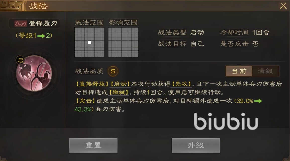 登锋履刃和勇冠三军效果非常相似,所以放到一起介绍,分别属于袁绍麾下大将文丑、颜良。相同点是在启动之后都能获得先攻状态,此状态加持下攻击对方不会受到各种反击效果影响。区别在于登锋履刃接下来附加的是缴械效果,而勇冠三军则是震慑,虽然都属于控制,但效果不同,缴械之后对方无法使用兵刃输出震慑则是将对方控制住。