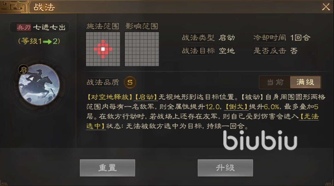 七进七出属于赵云,启动之后需要手动选择目的地,赵云会直接冲刺过去,并且无视路径中各种地形。到达目标位置后被动效果生效,周围敌军越多则自身叠加全属性也就越高,还能获得倒戈状态。还有一项效果是只要拥有此战法,场上还有其他队友存在那么携带者就不会成为选中对象。这样即使冲进敌人数量非常多的地方,也不用担心被集火秒掉。