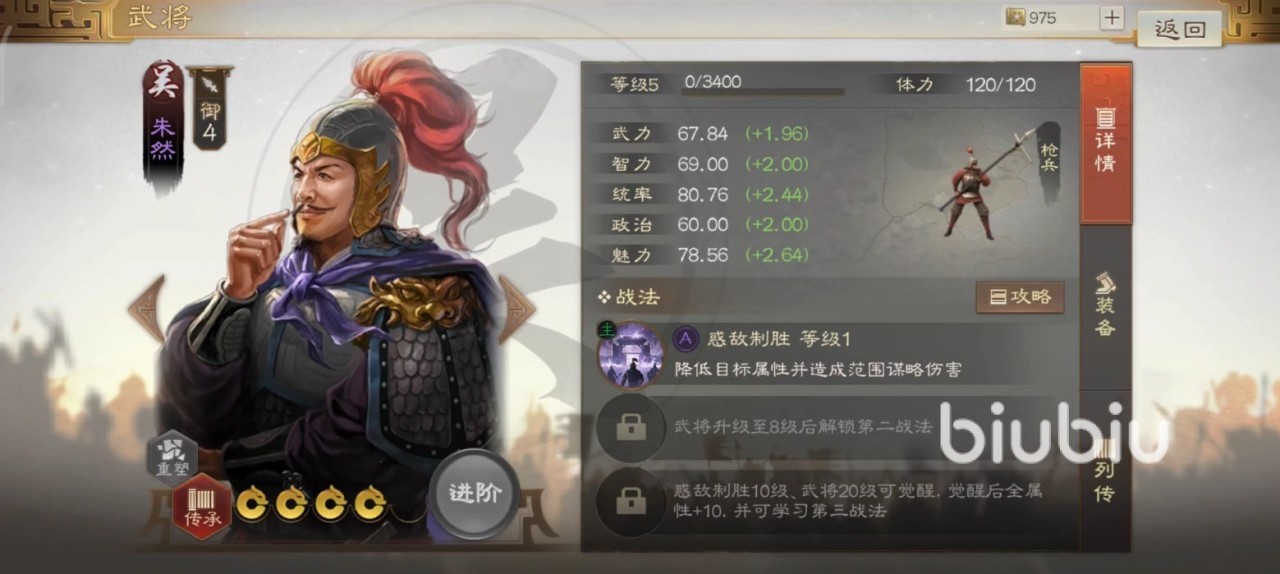 介绍了兵刃输出的,推荐一个谋略(法术)输出的,吴国的朱然,范围法术输出并且还能削弱灼烧状态敌人的智力,削弱智力就相当于降低对方的伤害。搭配一个黄权效果非常好,黄权先手挂中毒和灼烧,朱然后手输出效果非常不错。