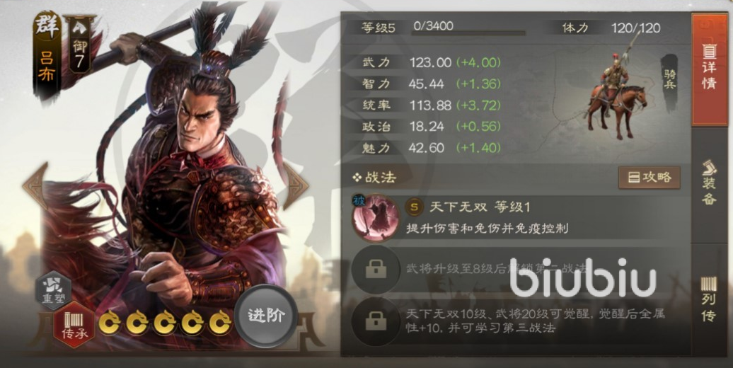 董卓拥有游戏中最出色统率值,这样想打掉过多兵力是非常困难的,自身并不只能挨打,还有很好输出技能效果。每次在自身回合结束之后,都会对周围在施加群体伤害,随着暴虐层数增多伤害也会稳步提升,非常适合打防守。吕布是全场武力最高的男人,开战之后直接获得无双状态,这是可以叠加的效果,层数越高带来各项加成也就越多。战斗到最后叠加三层以上可以免疫所有控制效果,真正做到无人可挡疯狂输出。