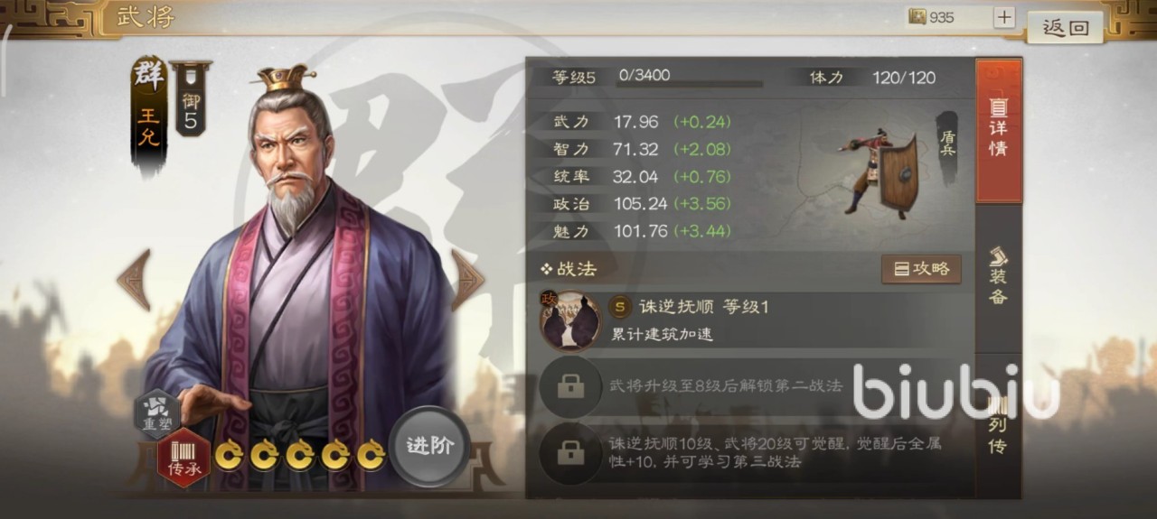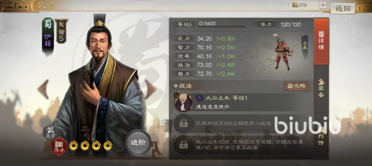 这个游戏里橙卡战法有1个自带的和1个传承的,传承的是自己作为材料给其他武将用的时候,别的武将可以获得的战法。一个武将加上自带的技能,最多可以拥有3个,而紫卡的传承战法就是其自带战法,大家想入手的“大兴土木”正是出自蜀国谋士“伊籍”。
