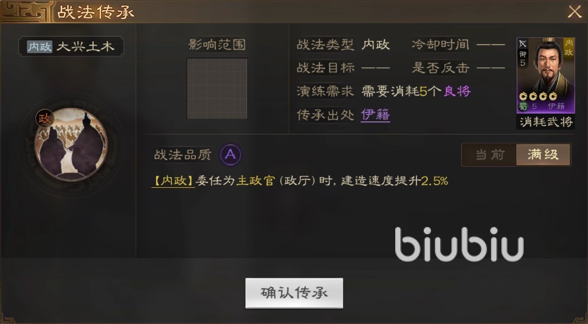 如果你在抽卡、或者内政寻访的时候有获得这个武将,可以保留。这个技能的效果是提升最大2.5%的建造速度,当然前提是被任命为主政官。将其作为传承战法给到那些专攻内政的谋士就挺不错,例如裴秀,他自带的战法能加快攻城器械的建造时间。