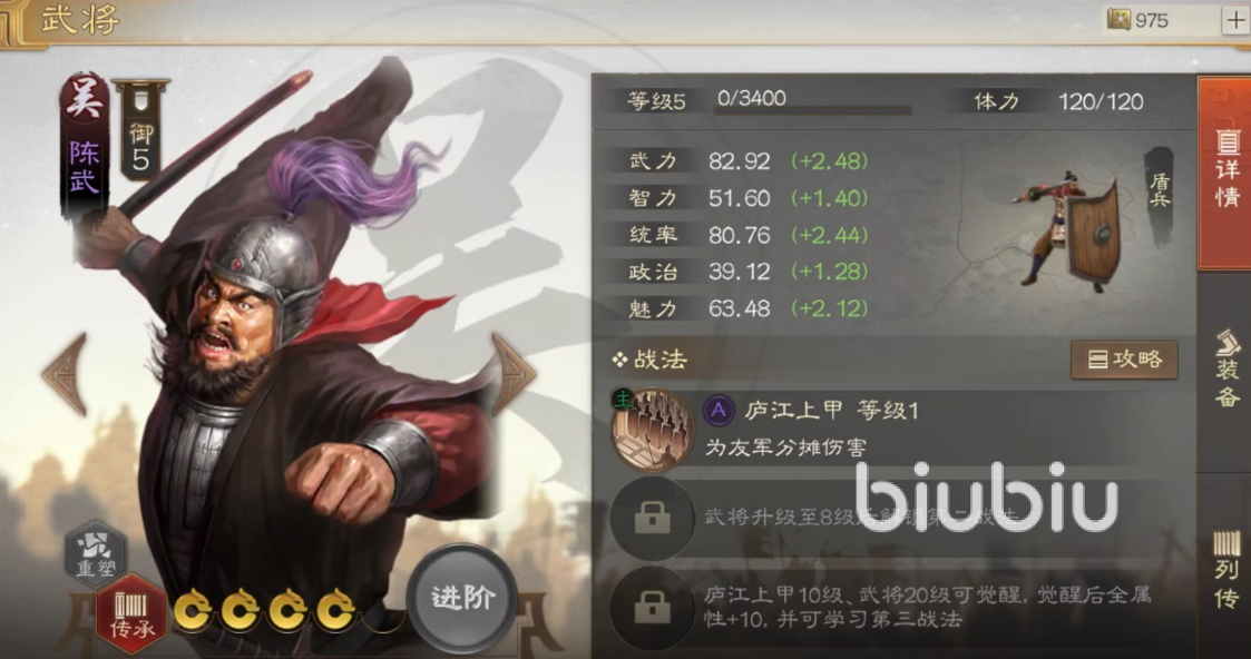 用于华佗是个辅助类英雄,皮很脆,所以就需要配合两个比较肉的坦克去打前阵。这里推荐大家用陈武和朱桓,它们都是统帅值很高的角色,拥有高额的血量以及防御值,可以统领大量的盾兵。另外还带有主动战法,可以释放一个强力的护盾,为队友以及自身抵挡不少伤害,生存能力非常强悍。然后陈武还可以分摊伤害,当你的华佗被人攻击时便可让他不至于被快速杀死,还有时间去恢复血量。