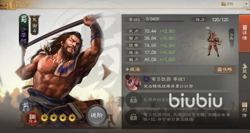 最后还可以再搭配一个输出武将,那就是沙摩柯,这个武将与夏侯霸有点类似,都是自带可以降低敌人统帅值的战法,能够大幅度削弱敌人的血量,搭配上高额输出,瞬间就可以秒杀一个没有防备的敌人。在前期开荒的时候,能够迅速地攻破每一个倭寇的据点,在于其他人做斗争的时候,能够助你快速占领各种城池。
