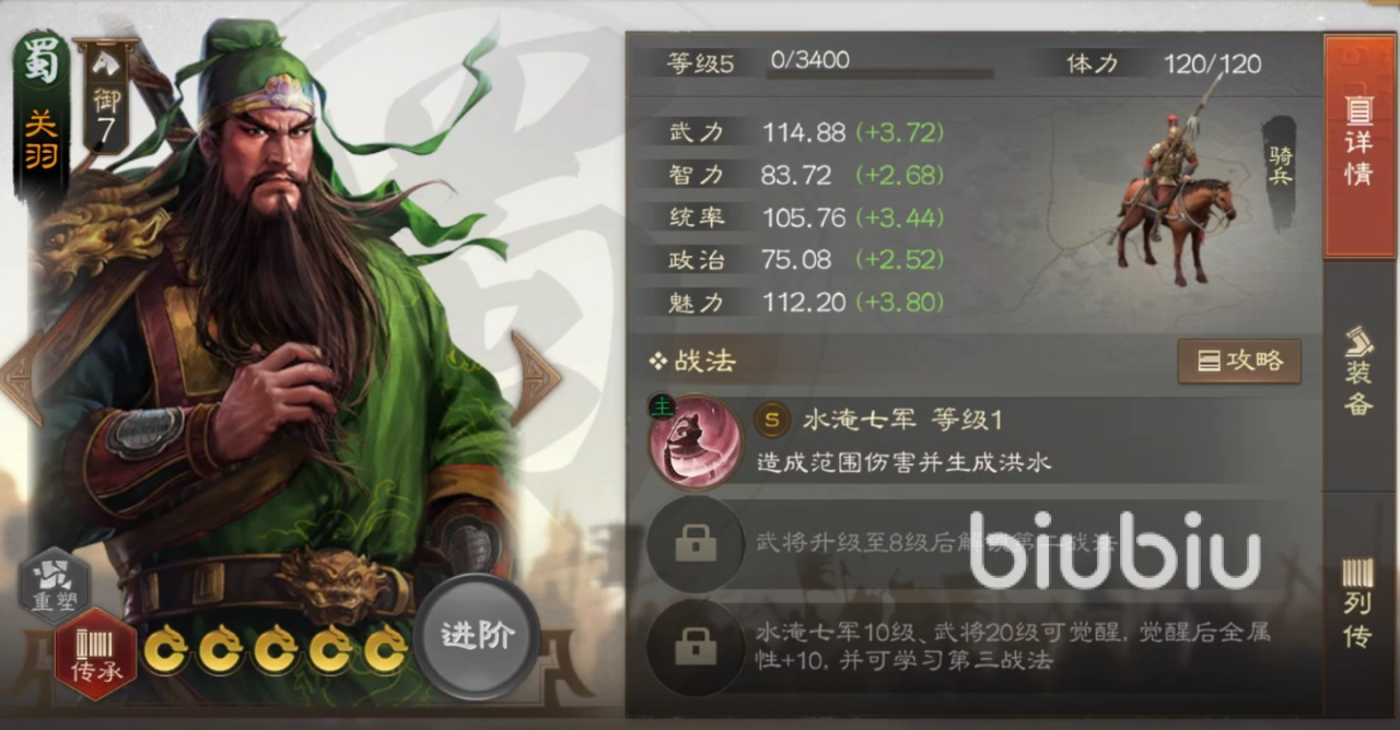关羽的技能非常相似,同样是选定区域释放后,除了武力伤害之外会生成水淹区域,在此区域内不分敌我都会受到限制状态。降低对方移动力使其很难跑出施法范围,而且对方输出也会大大降低。单单是这两名武将就已经能贡献出绝大多数输出,后面的人选非常随意,抽到刘备之后就补充进来,利用全属性提升和治疗以及伤害分摊特性,强化续航作战能力。