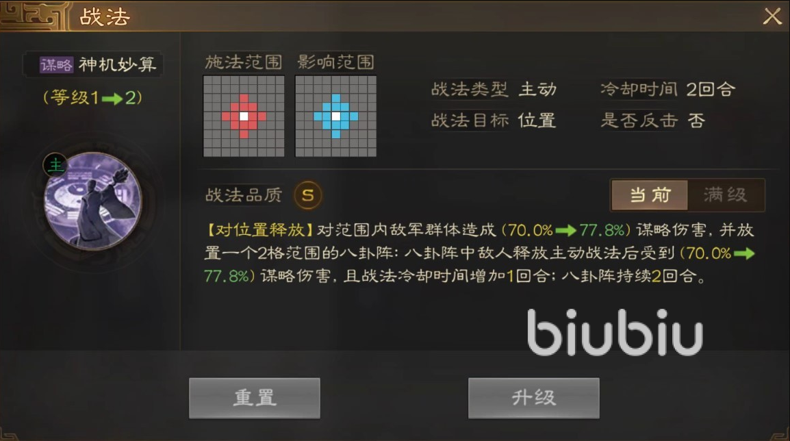 诸葛亮和关羽不仅在自身属性方面已经登峰造极,分别是武力和智力巅峰,技能上也有很多神奇效果是其他角色所不具备的,诸葛亮战法在释放之后会在原地生成八卦阵,除了一次高额伤害之外,只要对方处于阵型中,每次释放主动技能都会受到伤害,并且其战法冷却时间增加一回合。这样不仅输出足够高,还能限制敌方节奏,只要选好放置位置,能够影响到绝大多数敌人,就算成功。