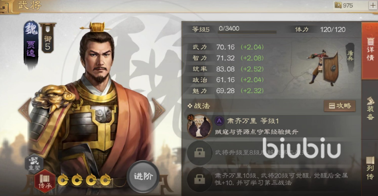 贾逵是魏国里的一名将士,主要掌控的是盾兵,所以他的血量相对来说会高一些,因为他的统帅值也不低。其他属性上还是比较平均的,各位可以凭借着自己的喜好让他充当不同位置的角色,可C也可辅助也可作为坦克使用。此外,他是一名紫卡,前期占用的培养资源不会太多,如果合理利用的话,能让你更好地成长。