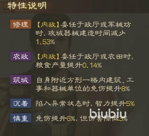 这个武将起到的作用更多的是修葺城墙以及培养队伍的作用,所以他的特性也大多数都是这类型的。当他处于政厅的时候,便可大大缩减攻城器械建造的时间,并能提升粮食的生产速度,还可以让自己的建筑获得一定的免伤效果。总之对于萌新来说,拥有他便可节省你更多的发育时间。另外他还自带减伤减控效果,在面对敌人来袭时,不至于一下子就俯首,让你能空出更多的精力去面对突发情况。