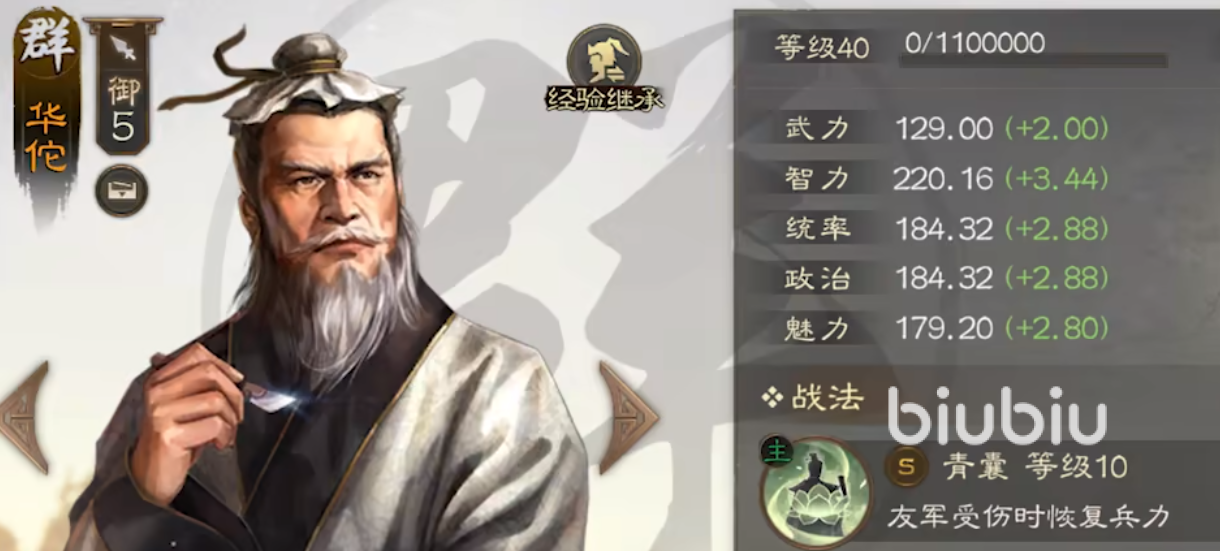正所谓铁打的辅助,流水的主C,不管是哪个游戏,都需要有一个强力的辅助来战场,怎么培养都能用。在这里推荐各位使用华佗,他拥有超高额的智力值以及统帅值,能够一次性统御大量的枪兵。并且传承战法叫做青囊。可以主动地位队友兵力恢复生命值,并且在友军兵力受损的时候,主动恢复你的兵力。就仿佛变成了一个打不死的小强,越挫越勇。