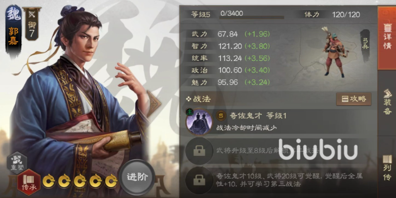 除了战士之外,大家自然也需要个后排C位,郭嘉就是个万金油的存在。不仅拥有高额智力,还有着强大的战法。他的自带战法可以对单体敌人造成爆发性输出,并且还能提升自身的治疗效果。搭配上华佗的治疗能力,可以瞬间将他的血量抬满,从而处于不败之地。另外还能减少战法冷却时间,可以持续性地输出,非常无解。