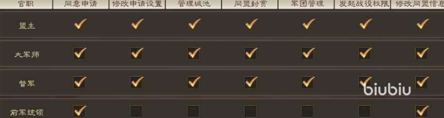 这些职位上的人员每一个都有自己的权限,像是大军师和督军他们就是管理城池,封赏,发起战役和修改同盟信息的权限,而四位统帅的权限则只有同意人员进入盟会和修改同盟信息的权限,四位核心骨干的权限要比大将军和督军少上很多。