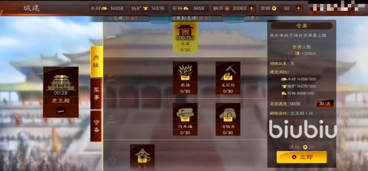 当然除了村庄生产生产以外,本作品中还有采石场、炼铁台和伐木场三大基础资源建筑,分别对应自产石头、铁资源和木头。这三样资源主要功能是玩家内政的发展,比如提升主城其他建筑的等级等等,对于玩家发展还是非常重要的。