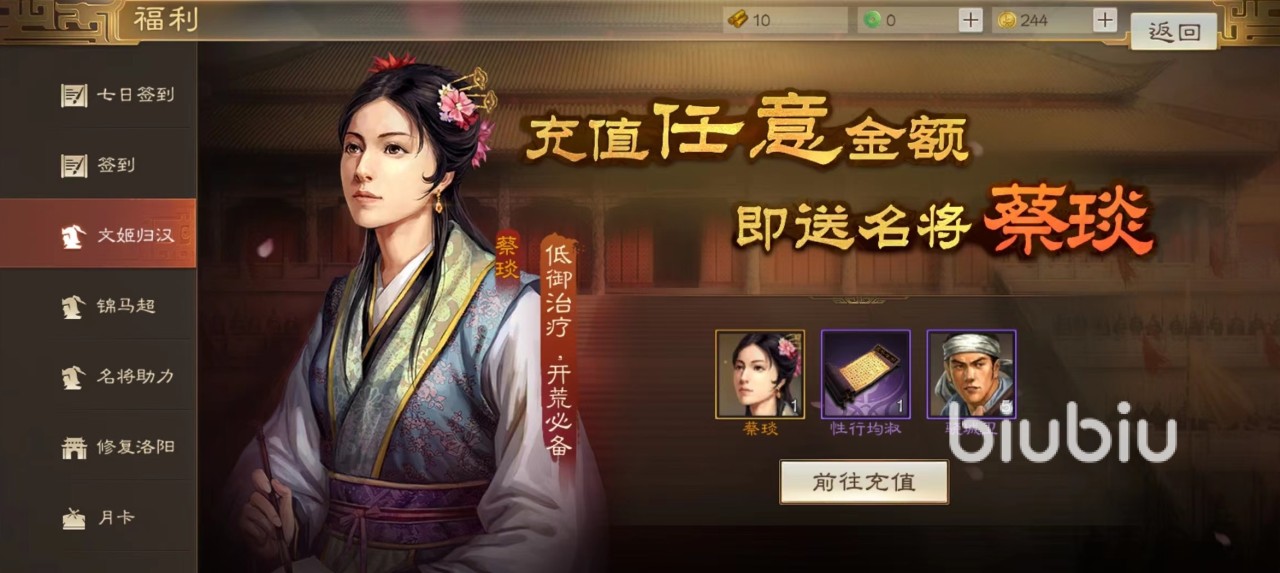 接下来是需要充值才能赠送的活动,在文姬归汉中充值任意金额就能赠送治疗神将蔡琰,也就是大家所熟悉的蔡文姬。这是在开荒时期很受欢迎的治疗角色,只需要三点统御就能出战,不占用团队中其他资源,可以大范围加血,提高开荒效率,完成首充之后就能拿下。锦马超需要充值68元后获得开荒神将马超,不仅仅是前期利用自身战法快速击杀敌人,后期还能直接搭配成为五虎上将组合或者是西凉玩法,属于从前到后都能一直用下去的角色。