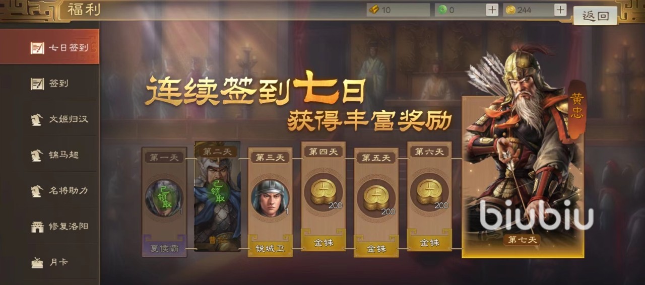 先来说一下免费获取的几项内容,在福利中通过签到能够获得三名不同橙色武将,分别是前七天能获取的曹仁和黄忠,以及到第30天免费赠送的大乔。曹仁和黄忠大家很熟悉,分别用于当做肉盾辅助和后排输出,这样就将阵容中最关键两方面配置到位,再搭配上其他一些紫将,初期阶段就能拉起阵容。而大乔是非常好用的治疗角色,能够为单体恢复兵力,也能依靠被动为群体加血,是很多阵容中不可缺少一员。