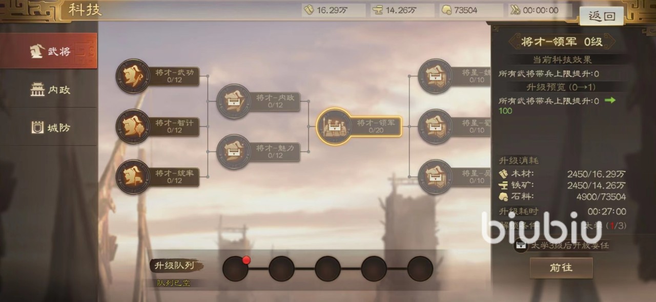 第三则是在主城中的科技方面寻找帮助,建立太学之后就能开始研发科技,分为武将,内政,城防等三个方面。在武将中就有对应兵力提升选项,找到将才领军功能,升级之后所有武将带兵量都会得到提升。属于一次学习终身受益效果,建议快速提升上来,及早受益。
