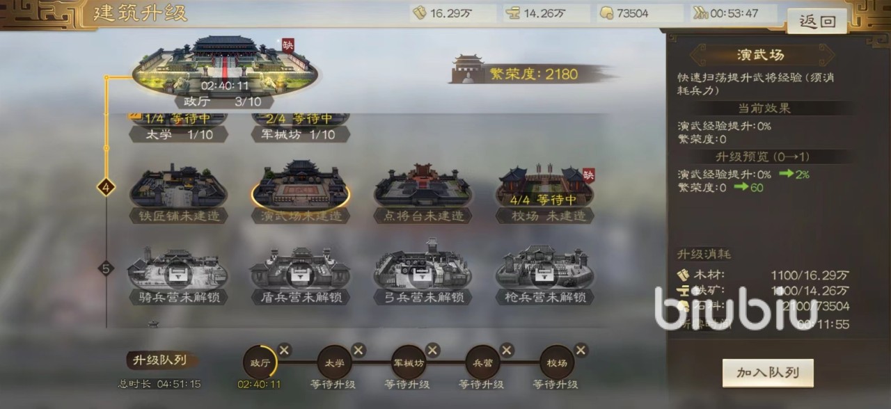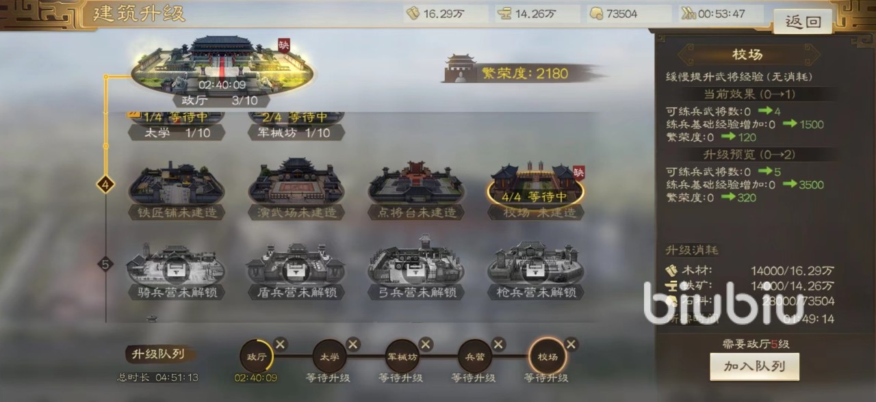 这两种建筑虽然都属于经验获取累,但是在具体形式上又有所区别。演武场在扫荡时候可以大量获得,但是要消耗兵力和正常攻占土地相似。校场则不需要任何消耗,但是提升非常缓慢,建议在每天下线之前将武将放进去,这样第2天就能收获。第2项是提高出战武将数量,目前每支队伍中最多上阵5人,但是因为当前统御不够,所以很难形成全套阵容。此时就要注意快速提升政厅,统御升高之后武将数量多了,自然带兵量也会提升。
