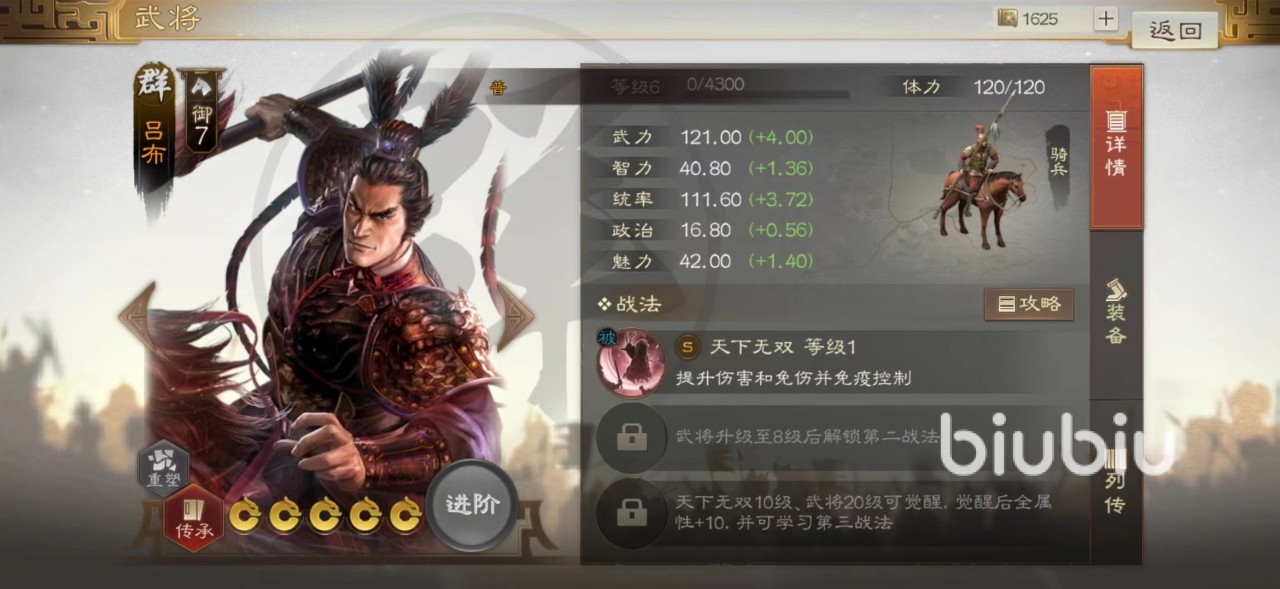 在群雄所有橙色武将中,小编认为能成为核心的只有董卓、马腾、张角、吕布这4人。吕布强势是在很多人意料之内,在游戏中自身不仅武力值达到最高水准,统率也有出色表现,这样在战斗时候攻击和防守都很完美。再加上自带战法叠加无双之后不仅伤害和免伤提升,还能免疫所有控制,这是其他武将很难具备的优势。所以吕布核心作用就是不断输出,然后收割,在搭配战法上也是全部选择橙色,无论是一骑当千、横扫千军都很合适。主要队友搭配为和华雄、张辽等,一起出战快速突击对方。