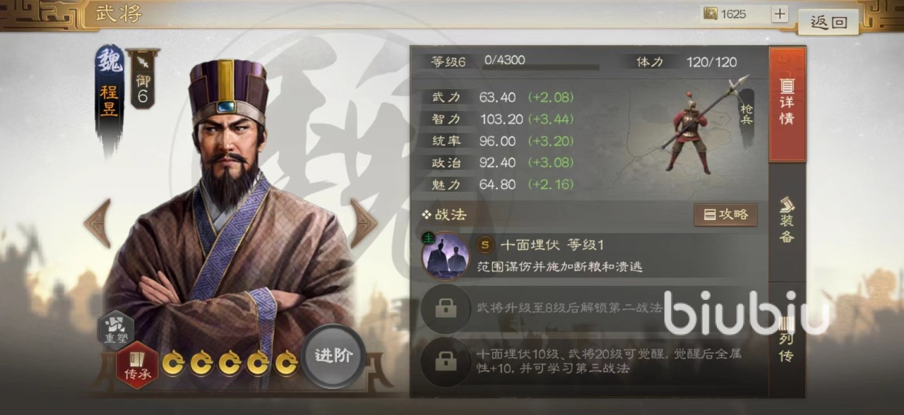 在搭配上也就很清楚,如果是选择其他战法,那么自然是同样能够附加断粮的技能,这样叠加到比较高比例才能真正限制,不然仅有50%根本达不到最佳效果。而且鉴于伤害类型,依然是谋略型使用更加妥当。小编非常推荐给程昱装备上,程昱作为魏国中的橙将,但是自身一直难以进入核心。战法十面埋伏可以造成谋略输出,同时附加断粮和溃逃这两个状态,现在又有了断粮技能,就可以自己叠加起来,重要性逐步上升。