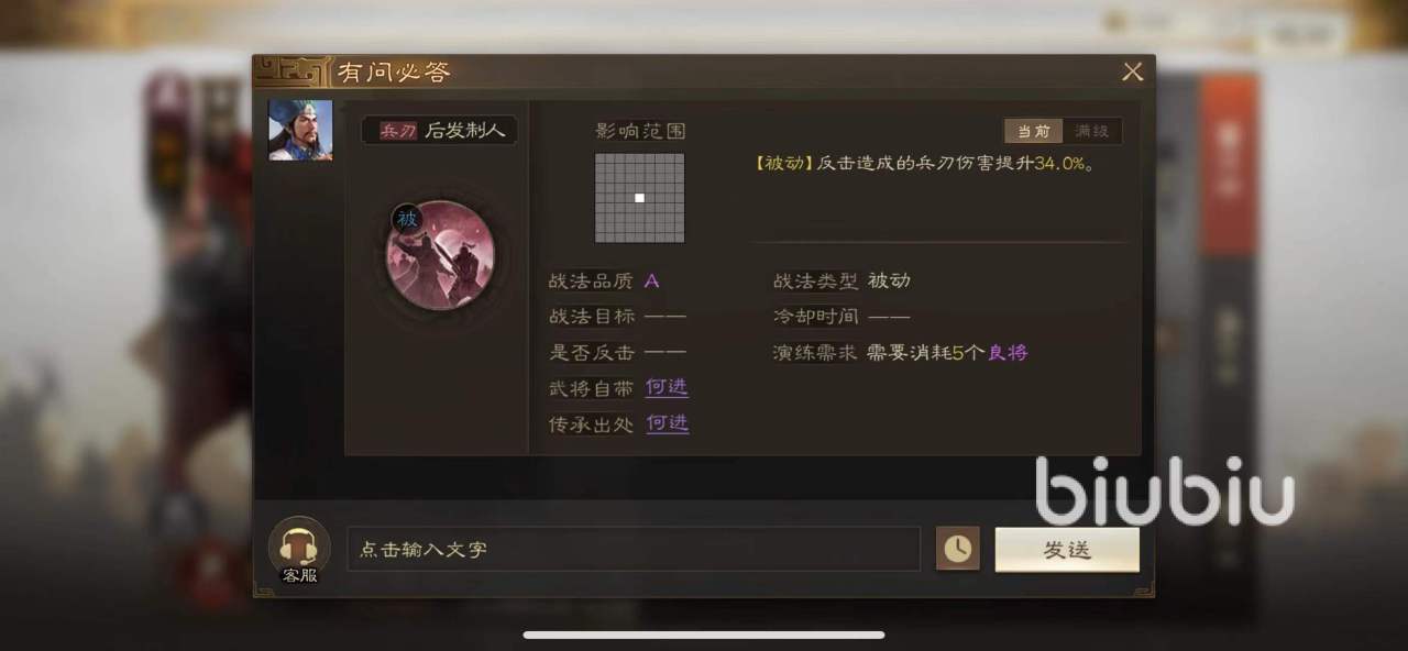 由于每个盾辅被攻击后都能进行反击,所以这里建议各位用提升反击伤害的技能。这里可以用后发制人战法,来自于武将何进,当你在受到敌人攻击时,便可提升高达百分之三十四的反击伤害,还是很给力的。