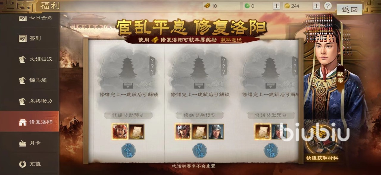 对于平民玩家来说,最关键的就是如何能获取到足够多的武将组成阵容,这一点就需要从系统所开放的免费活动入手。在开服7天之内每天保持登录,就可以获得两个橙色武将,分别是肉盾型曹仁和远程输出黄忠,这两人在橙将中并不属于强势类型,但是免费赠送之后前期开荒就有了着落。然后是要积极参加修复洛阳活动,在本个赛季都有效,里面赠送的都是核心选择,例如太史慈,关羽等,将这些获取之后就有了发展基础。
