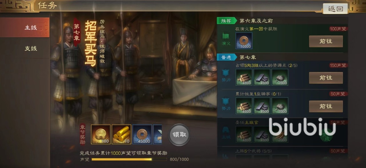 除了武将获取之外,接下来要进行的就是各种能获得金铢活动,主线任务、支线等全部奖励一定要拿到,奖励的金铢不要留下,全部用于招募武将。即使橙将几率低,但是获取紫色之后也能分解出大量战法,利用战法方面搭配优势弥补武将劣势,也是平民玩家主要需要进行的。