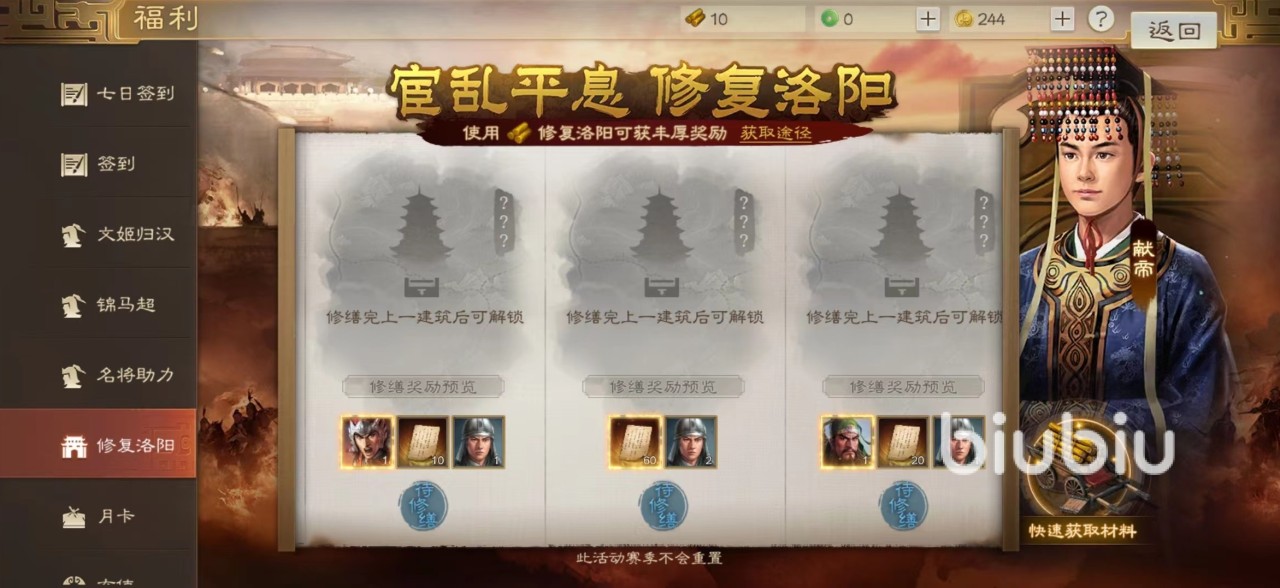其他活动还有参加修复洛阳,这是也是一项需要努力多天之后才能逐步解锁的奖励活动。但是赠送武将很多,有孙坚、太史慈,关羽。这三名角色并不像曹仁、黄忠那样属于普通武将,而是各自阵容和玩法的核心。孙坚擅长伤害和嘲讽,再加上自身属于盾兵抗揍能力很强,属于东吴主要流派里的肉盾。太史慈是弓兵型武将中输出最出色一个,本身就带有连击效果是远程打击核心。关羽更不用多说,蜀国很多阵容都少不了他的加入。