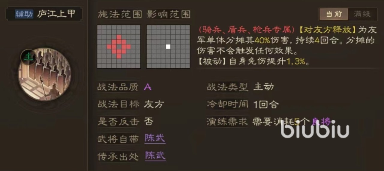 这是一款a级品质的战法,属于主动释放类型,在使用之后进入到一回合冷却时间,而且只有骑兵,枪兵和盾兵,武将才能使用。要想获得需要先得到武将陈武,然后在传承功能中分解掉就能获取。效果是使用之后选定友军目标释放,可以为其分摊受到的伤害,分摊过程持续4个回合。