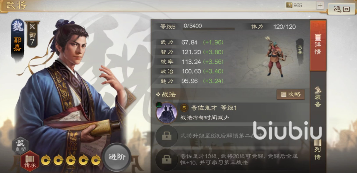 如果你比较喜欢法师类型的武将的话,选择郭嘉无疑是一种很好的选择。他属于魏国的橙卡,拥有着超高的智力以及统帅值,可以迅速地统御大量弓兵,进行远程射击非常给力。另外他的技能才是他的核心玩法,可以不断地减少战法冷却时间,减少一个回合。所以不管是佩带控制技能还是辅助技能,都可以搭配他的输出技能,轻松打出爆炸输出,还能避免被敌人秒掉。