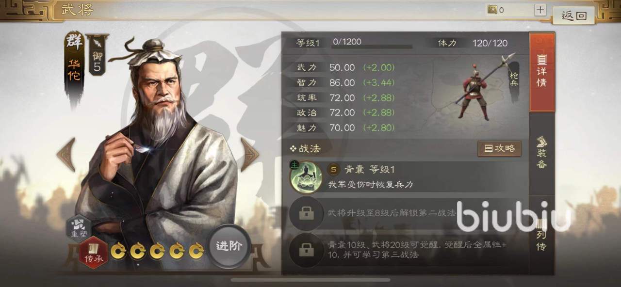 若是你更加喜欢安逸一点的打法的话,则可以选择这个强力的奶爸辅助—华佗。毕竟主C会随着版本的更替慢慢变弱,辅助却不管在哪个阵容里面都有一席之地。华佗的智力值很高,能够稳定地给一个队友进行治疗,避免你的主C给人秒掉。另外还可以给军队里的其他士兵进行群奶,施加一个群奶buff,并且没有回合限制,而且他还能降低枪兵受到的伤害。