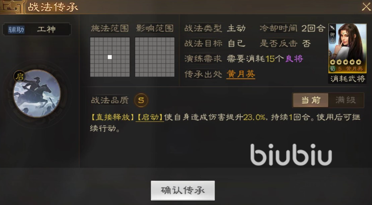 首先你需要拥有一个武将,并且这个人物的可继承战法还得是工神战法。其实这个技能来自于蜀国五星得力战将黄月英,身为一张橙卡她的技能品质自然也不会低,是S级别的。所以获取难度自然也就高了起来。