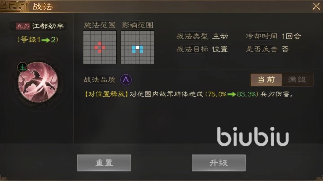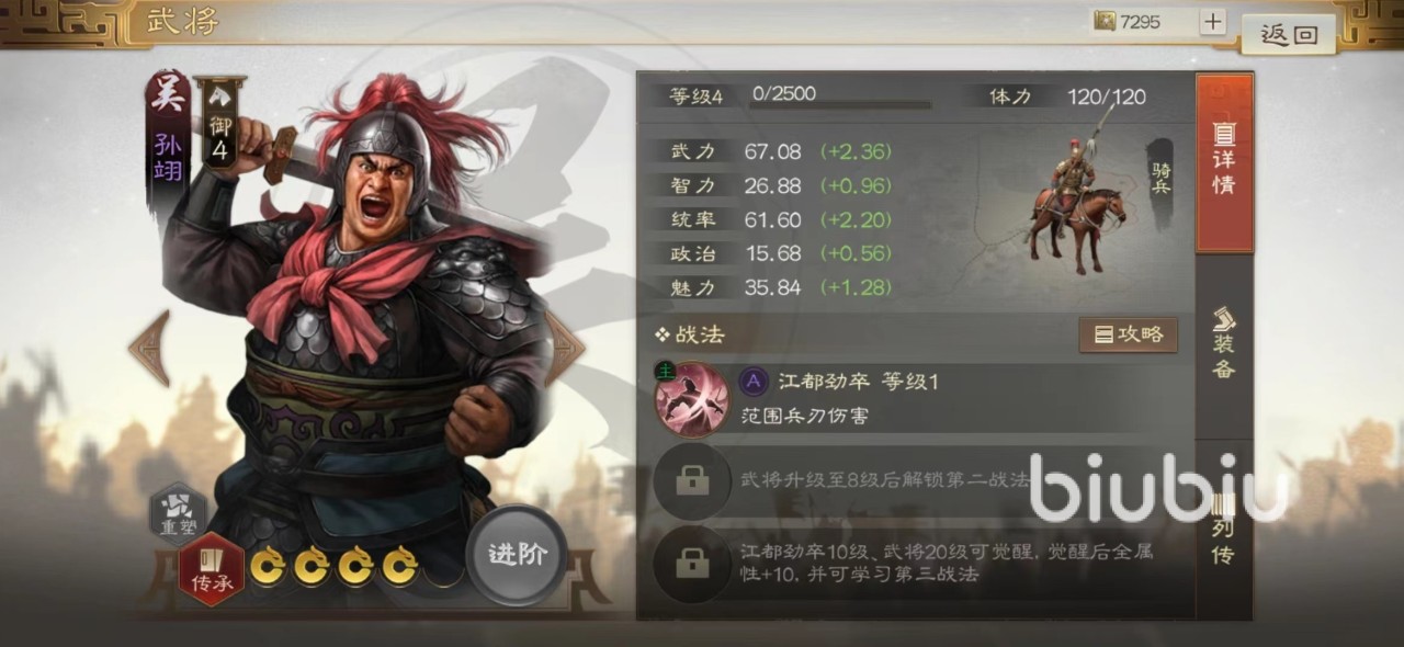 说到江都劲卒,获取来源是一个并不知名的东吴紫色武将孙翊,即使不熟悉该武将也没有关系,只要在各种抽卡渠道中抽到之后,直接在传承中分解掉,就能获得该战法。因为武将本身属性一般,所以没有出战必要,不用可惜直接分解掉才是最佳作用。此技能效果是在释放之后会对范围内敌军群体造成伤害,达到满级时伤害比率为150%,虽然不高但是释放位置比较讲究。如果能伤害到尽量多的敌人,总量还是很可观。