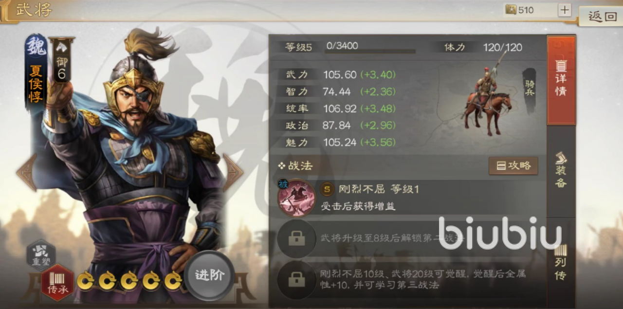 最为推荐的是夏侯惇这位名将,这位名将的自带战法是“刚烈不屈”,效果是只要受到敌方伤害就能够提高自身的伤害和免伤,并且获得最高六层的增益BUFF“纳降”,也就是“你越打我我越兴奋”,那么只要保证在战斗的进程中,夏侯惇不被秒杀,叠加到6层的BUFF效果非常惊人,伤害提高了将近30%,这是十分巨大的,加上主动技能“趁虚而入”,基本是开荒期间可以直接秒怪的。