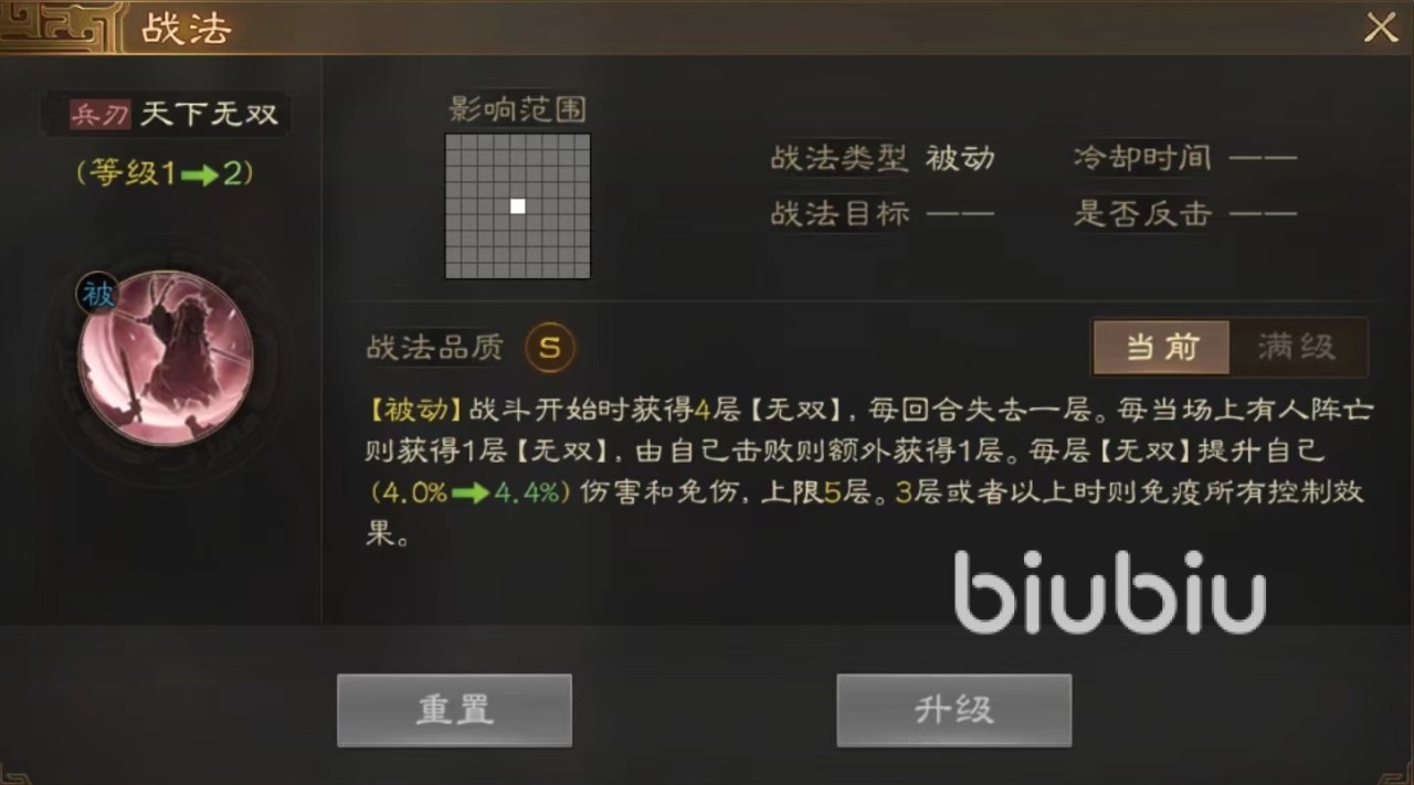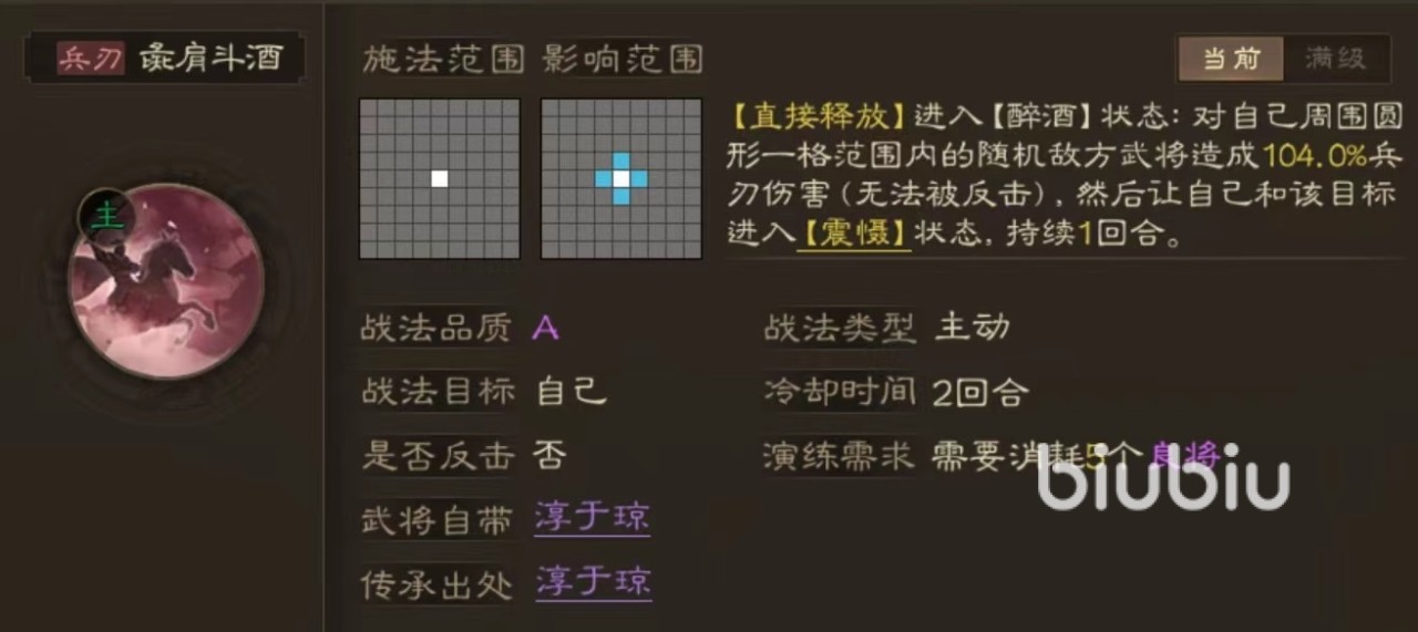 这一技能来自官渡之战中最出名的淳于琼,这名因为醉酒而使袁绍输掉战役的角色,虽然自身实力拉垮,但是所分解出来的技能却极其好用。需要手动释放,中间有两回合冷却时间,使用之后直接进入到醉酒状态,再自身周围一格范围内的圆形区域里所有敌方武将中,随机选择一个对其造成兵刃伤害。输出之后不会受到对方反击影响,接下来让自己和该目标同时处于震慑状态。