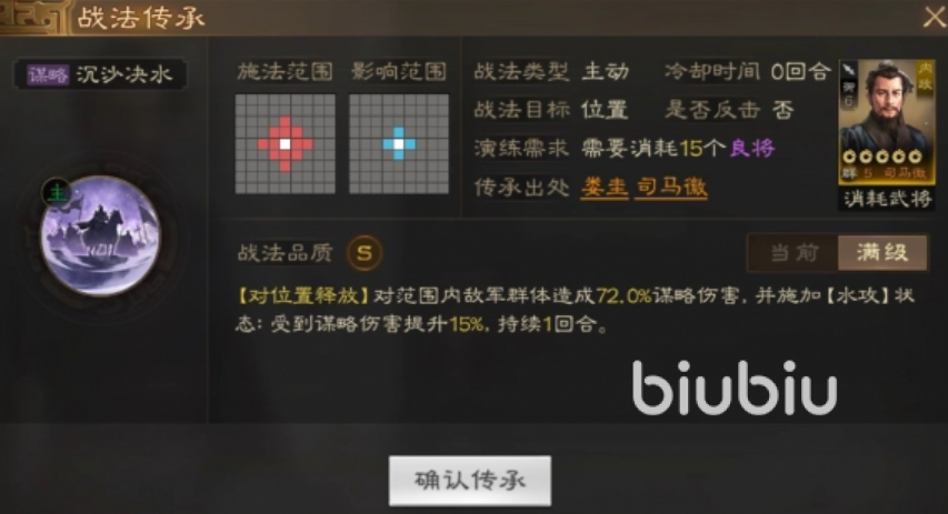 他的传承战法名为沉沙决水,可以自由选择施法位置,对一定范围内的敌人造成谋略输出。并且该技能没有回合限制,每次都可以使用,另外他还能叠加伤害。