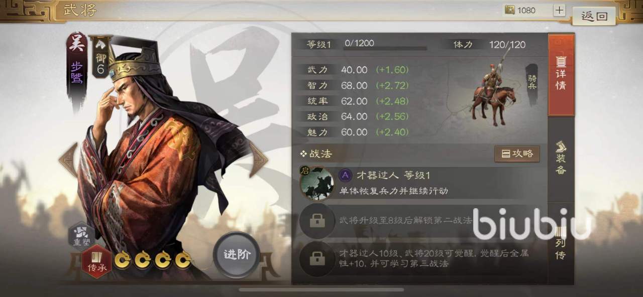 该战法传承于防御六星的步鹭,他的整体属性其实挺均衡的,就是武力方面差了一点。所以可以看出这个武将是主打辅助角色的奶爸,他所统领的是骑兵。能够不断地向前冲刺,所以还是持续作战能力挺强的一个武将,并且是紫卡,在获取难度上会更低一些。