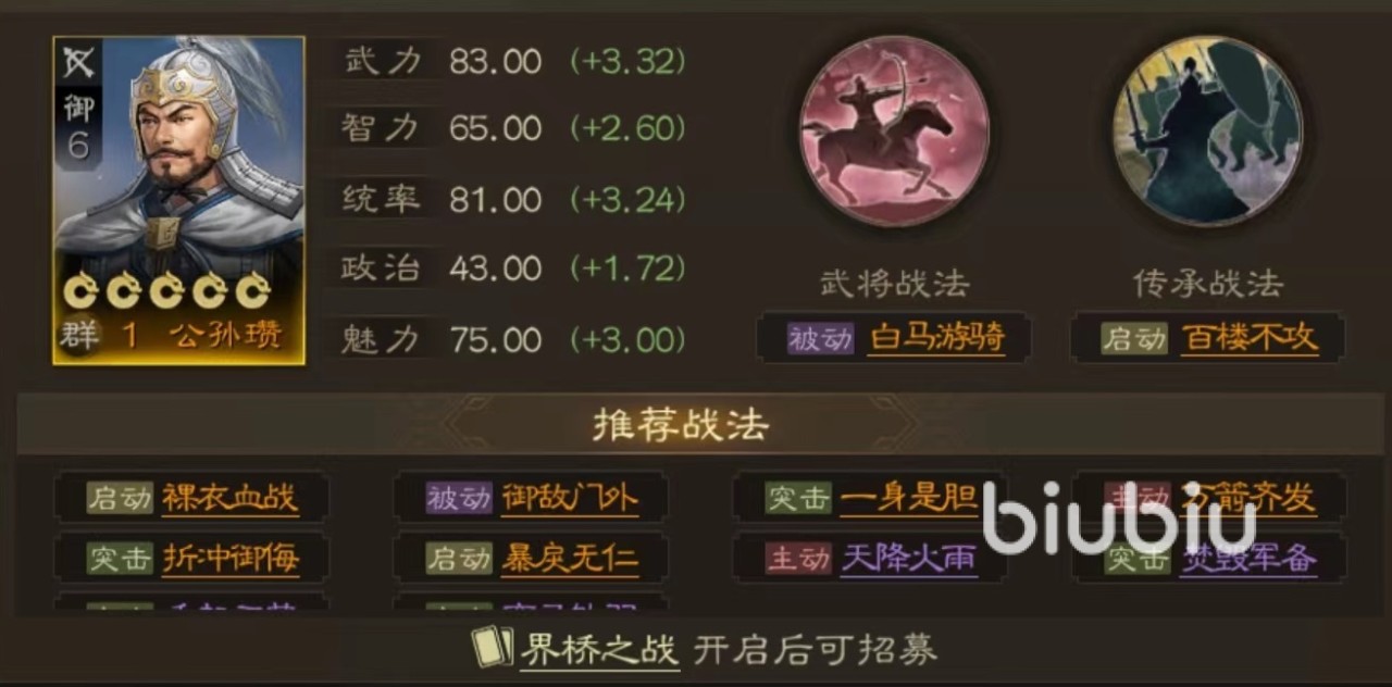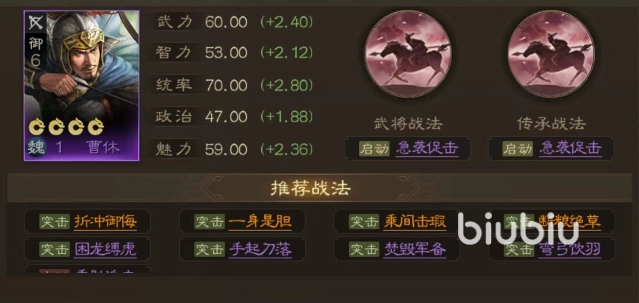 能够满足这些条件的武将,有很多小编队推荐的是公孙瓒、曹休、太史慈等。公孙瓒作为弓兵型将领,利用自带战法白马游骑提高伤害之余也能增加移动力,在每次普攻或使用战法之后,根据剩余移动力数值计算再进行一次移动。所以优势就是不会将回合浪费在移动上面,保证每次出手机会。曹休同样是弓兵,自带战法在启动之后本回合将获得连击,可以额外攻击一次。