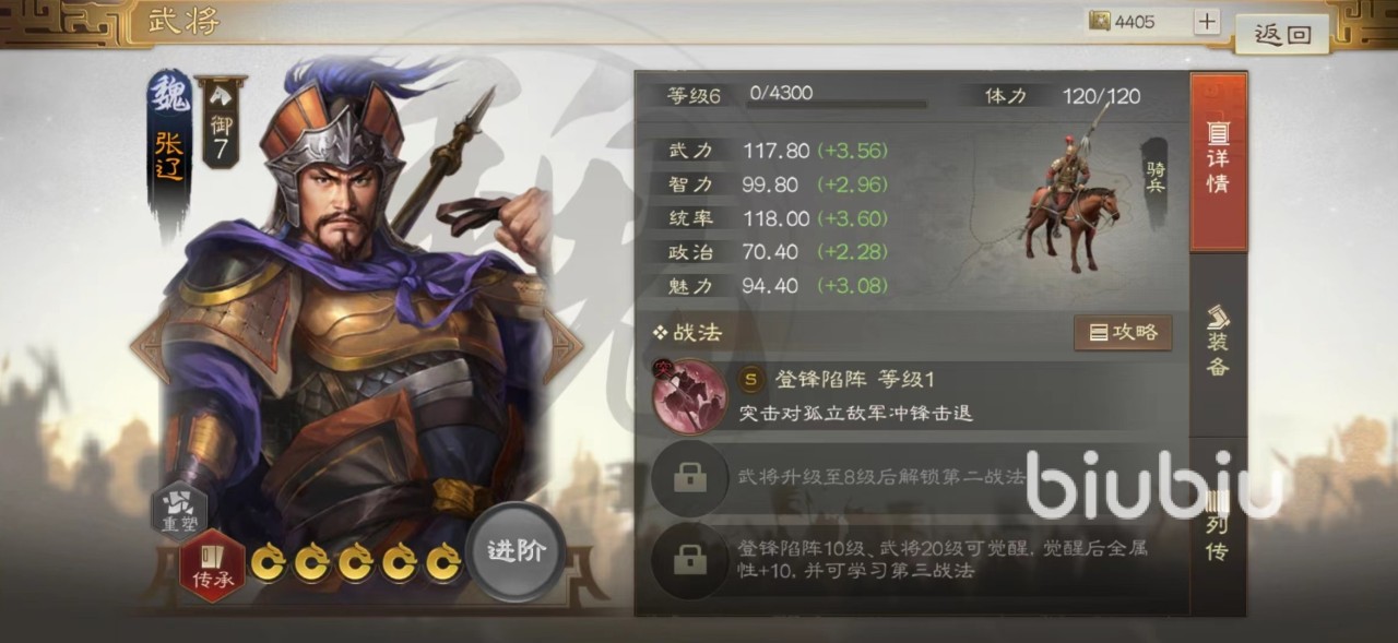 还有伤害提升效果,满级时数值为16%,也很可观,如果攻击目标处于孤立状态,则伤害再次提升。孤立状态指的就是对方周围没有队友。在攻击的时候对方要达到指定位置,如果过于靠前突出,就能利用战法所带来的伤害提升造成强力打击。在搭配上小编认为张辽自身是最合适人选,当然这需要多抽几张卡牌后才能实现。在自带战法影响下已经获得了先攻状态,不会受到反击,再加上必中,使张辽攻击变得极其犀利,而且对孤立下敌军,两大技能都有加成。