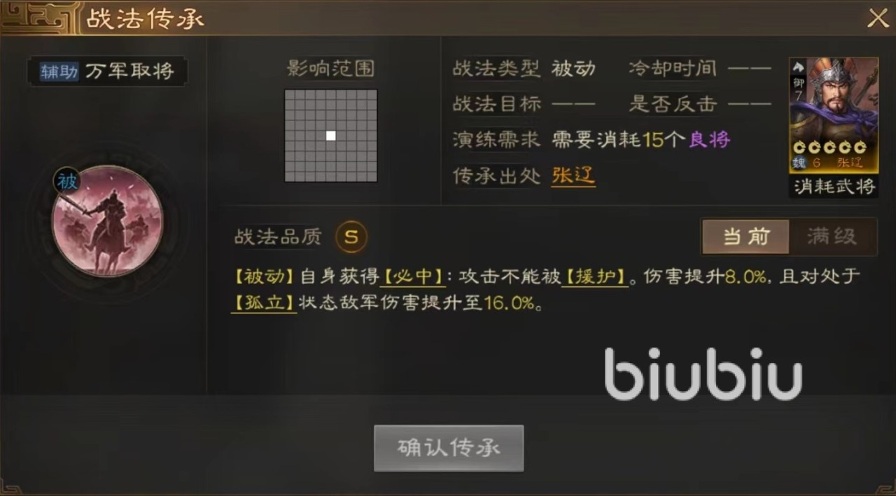 这一战法来自于三国时期猛将张辽,张辽在游戏中自身也是很多流派核心,所以将其分解要一定要下定决心,也要找好能搭配的对象。这一战法属于被动类型,是所有技能中最省心一类。效果是自身获得必中状态,必中并不是每次攻击不会丢失,而是不能被对方援护抵消掉。援护是很多辅助武将能添加的状态,例如曹仁、典韦等,释放援护后所有队友都能获得一次抵消伤害的状态。而拥有万军取将战法之后,就可以无视对方身上的援护。