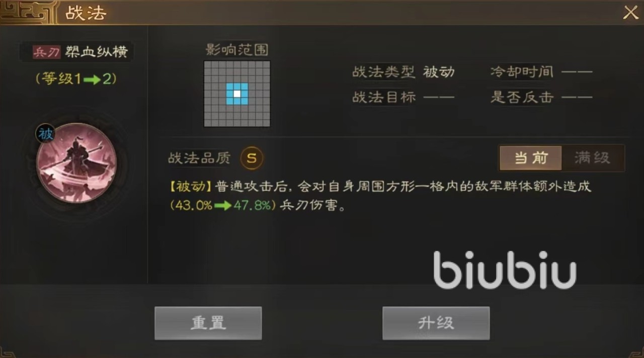 这是一个兵刃输出型突击战法,没有冷却时间限制,突击优势相信大家已经很清楚,那就是在回合中不会占用主动出手机会,效果是当触发突击之后,可以对选定目标以及其左右两边敌军额外造成兵刃伤害。需要尽量选择最佳攻击位置,能够伤害到数量更多敌人,如果能打满三个目标,单单是此战法附加的突击伤害就已经非常恐怖。