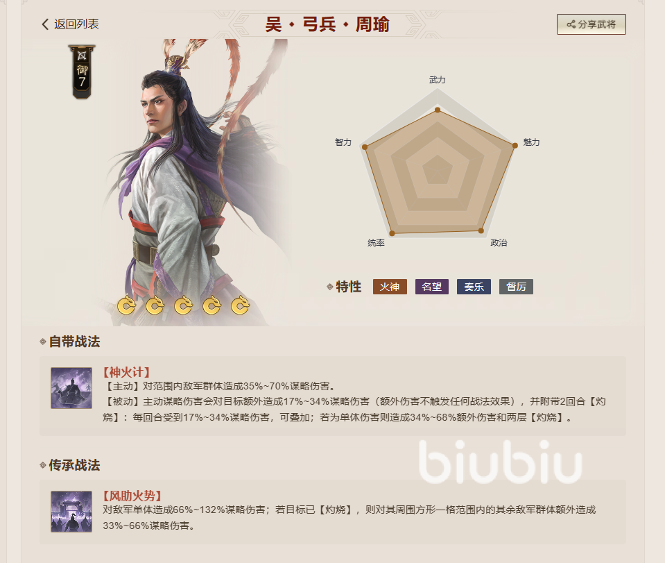 其次是周瑜的辅助,周瑜的自带技能神火技,可以搭配陆逊的连营使用,给敌人挂上灼烧buff,让二者的搭配产生1+1>2的效果!