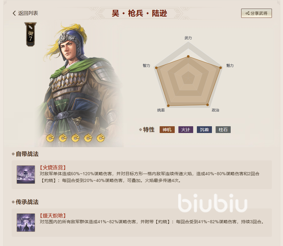 首先是核心陆逊,火烧队顾名思义当然是围绕着核心陆逊来进行搭配的啦~陆逊的部队是枪兵,是一名优秀的法坦,也是主要的输出位。技能火烧连营,可以在对敌人使用后不断扩散伤害,营造出“连营”的感觉~