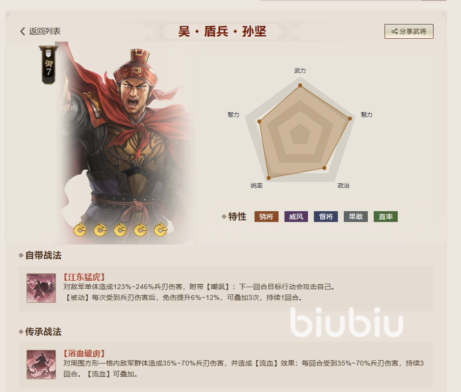 然后是江东猛虎孙坚,孙坚是吴国最好的坦克,江东猛虎技能大大提升了它的生存能力,为周瑜和陆逊提供了很重要的保护。
