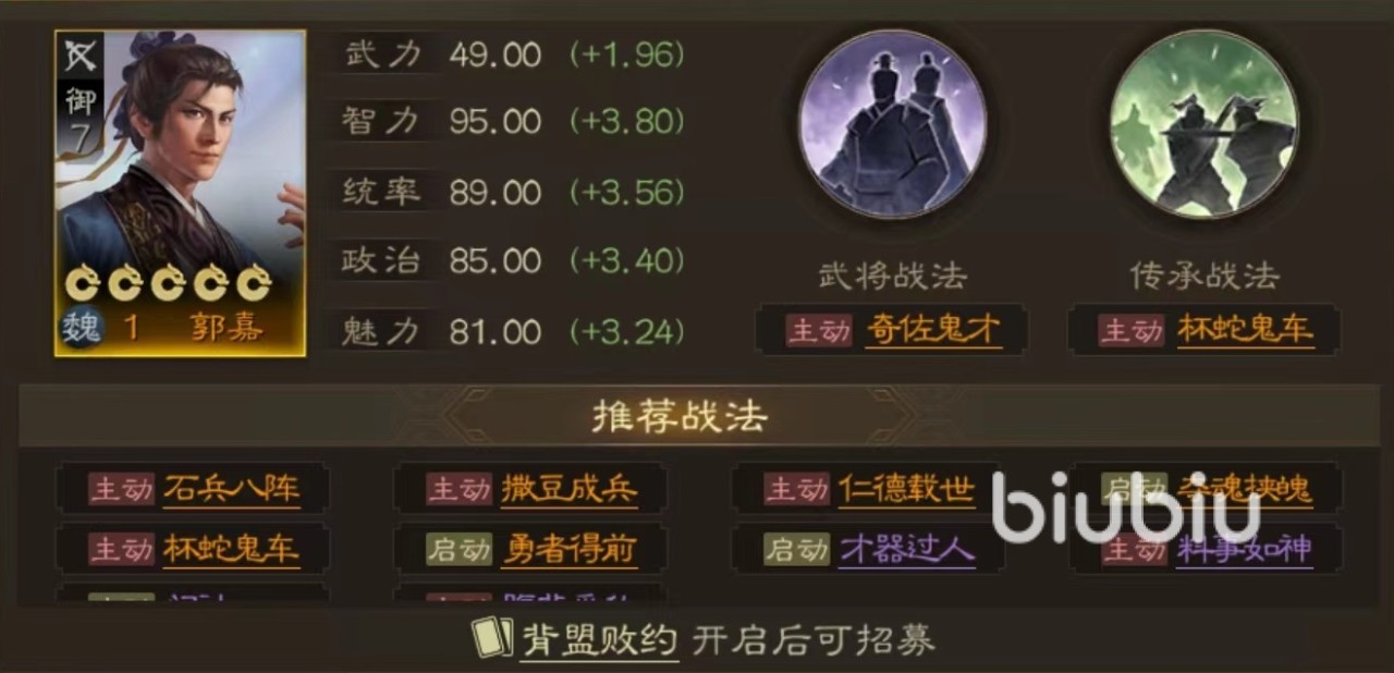 而石兵八阵阵配合起来最出色的技能就是诸葛亮自身携带的神机妙算,神机妙算是创造出八卦阵后续持续输出,如果将对方强制中转过来,不仅伤害目标增多,也能使其难以逃脱,这样就能将所有伤害打满。除此之外在搭配人选上小编强烈推荐郭嘉、周瑜这二人。这两名武将都是智力顶尖角色,郭嘉自身就能依靠被动提高谋略伤害,周瑜则是需要有足够多的目标来附加灼烧,方便火烧队其他队友输出。