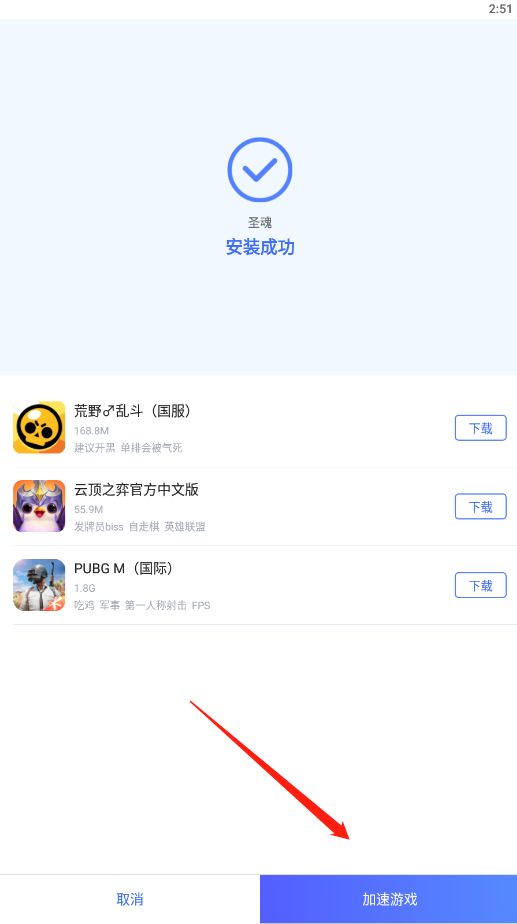 游戏圣魂安装完毕后,玩家可以直接点最下方右侧的“加速游戏”,然后进入加速通道。
