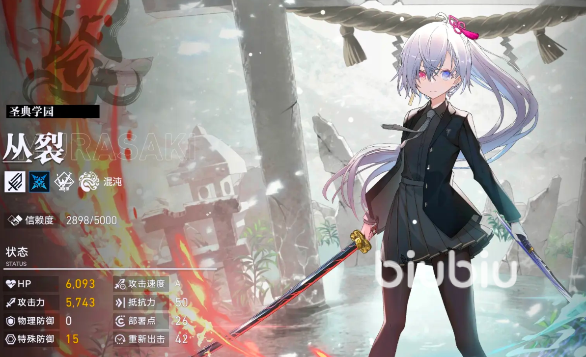 丛裂的特性能在出击后15秒内,让自身的攻击力提升30%,但是在出击期间血量会慢慢减少,她的“崩花雪月”会向前方放出8次攻击力16%的物理攻击,她的“里一闪”会向前方大范围放出1次34%5击的真实伤害攻击。
