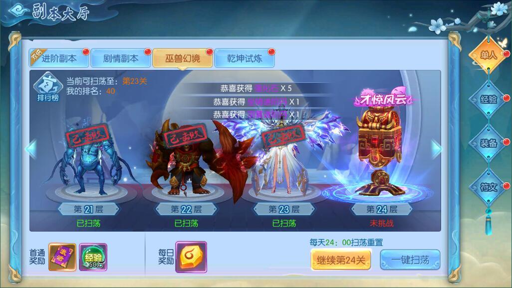除了以上的两种方式,还可以依靠巫兽幻境来获取英雄任务。玩家们在巫兽幻境当中进行战斗之后,会有一定的概率触发游戏当中的隐藏英雄任务,这类任务在完成之后,同样可以得到大量的英雄碎片。