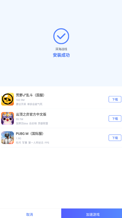 安装完毕后会显示如下界面,选择下方的“加速游戏”就可以立即打开游戏体验加速了。后续需要加速时,也需要玩家从Biubiu加速器的主界面中找到游戏再加速,直接从本地打开没有加速效果哦~